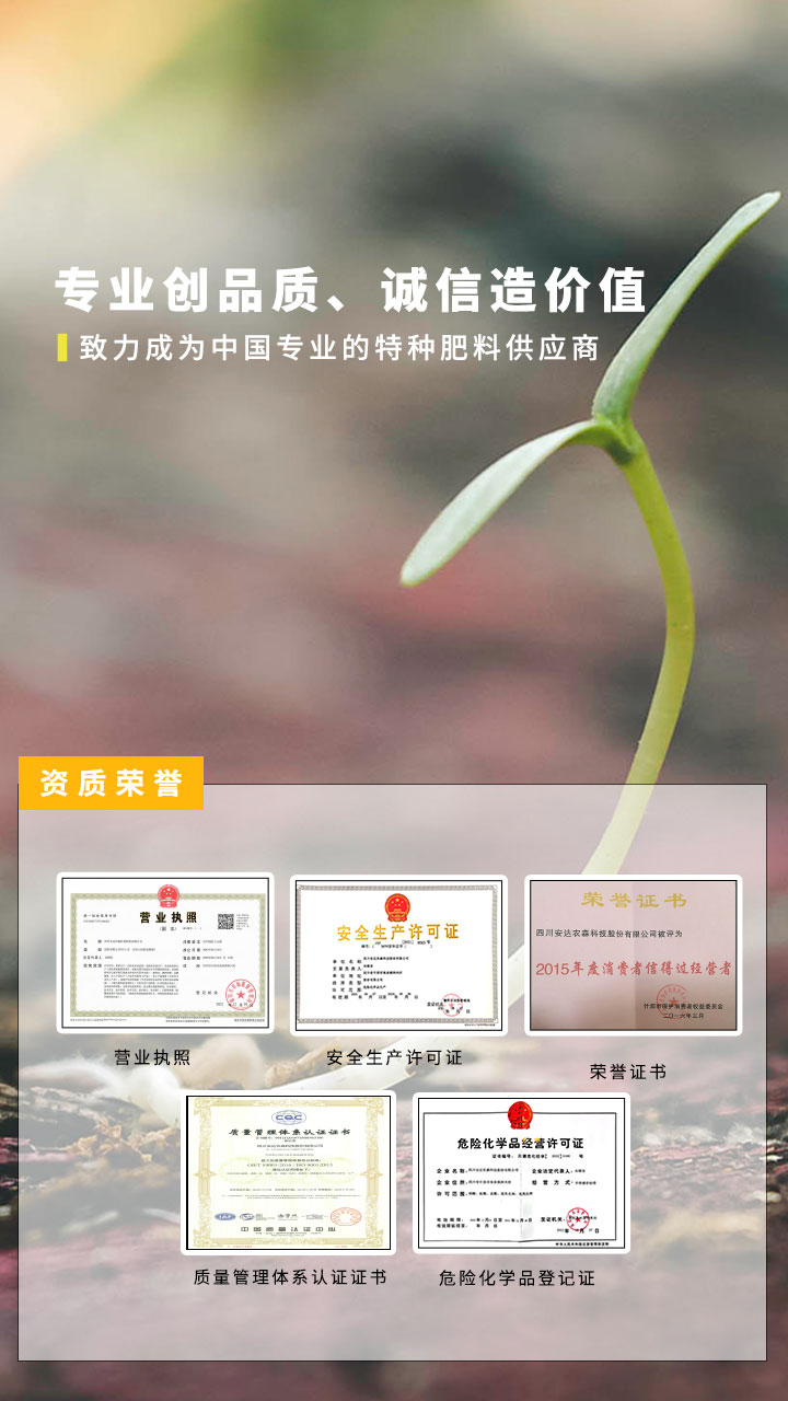 經(jīng)過二十余年的探索和實踐,依托自身技術和出口背景,按照國際市場規(guī)范培養(yǎng)了大批高素質的專業(yè)化技術化團隊,掌握了水溶性肥料的核心技術,擁有完善的研發(fā)中心、質檢中心,目前已獲得多個國家專利技術。公司一直把“做中國專業(yè)的特種肥料供應商”作為自身的發(fā)展使命。推廣高端植物營養(yǎng)與先進技術,高效施肥方式的綜合配套方案,減輕中國種植業(yè)勞動強度,讓種植業(yè)效率更高、效果更強、效益更好!努力成為革新中國種植業(yè)生產方式的偉大公司!